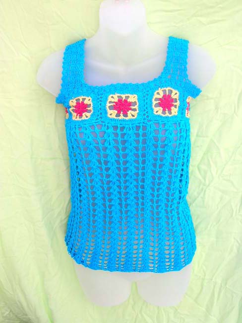 Blue knit tank top with red and yellow colored pattern at top